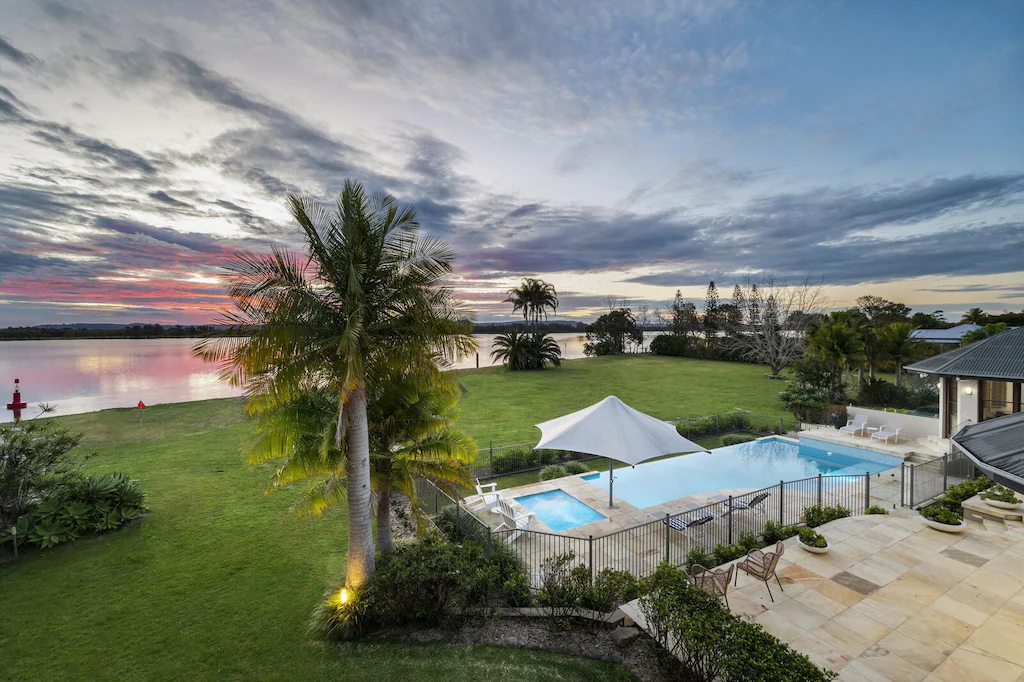The Palms Yamba is a private luxurious riverfront estate perfectly positioned behind a security gate on 4.36 acres with rolling manicured lawns that extend to the waters edge. Stunning architectural design throughout blends interior and exterior spaces to create seamless resort-style alfresco living, and sparkling river views are showcased from every vantage point.